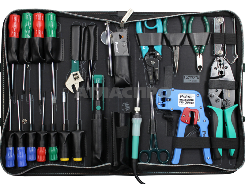 Набор инструментов ProsKit 1PK - 818B для работы с электроникой, зачистки и обжима проводов, коннекторов. В комплект входит паяльник.