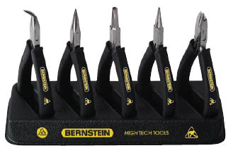 Набор из 5 инструментов с антистатическим пластиковым проводящим покрытием ручек: кусачки-бокорезы 3-601-13, плоскогубцы 3-632-13, щипцы-круглогубцы 3-633-13, конические круглогубцы 3-631-13, изогнутые щипцы 3-634-13; на пластиковой ESD-подставке для наиболее компактного хранения инструментов в вертикальном положении на рабочем месте; общий вес 320 г