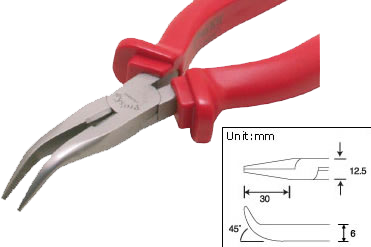 Длина губок 30 мм. Губки изогнуты под углом 45°. Резка медной проволоки диаметром до 2.6 мм, стальной - до 2 мм. Длина инструмента 160 мм.