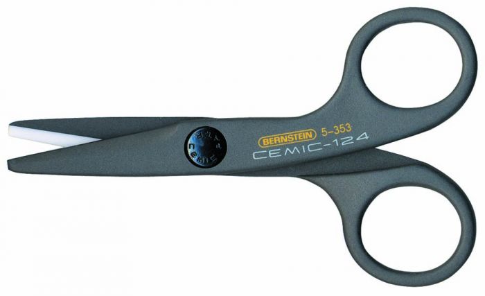 Антистатические ножницы с кольцами из прочного стеклопластика с высоким электрическим сопротивлением и износостойкими керамическими лезвиями длиной 45мм; общая длина инструмента 125мм, вес 30г