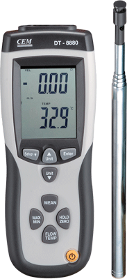 анемометр с телескопическим зондом, осуществляющим также измерение температуры 0.1 – 25.0, ±5%, 0.01 м/с. 0 – 50ºС, ±1ºС