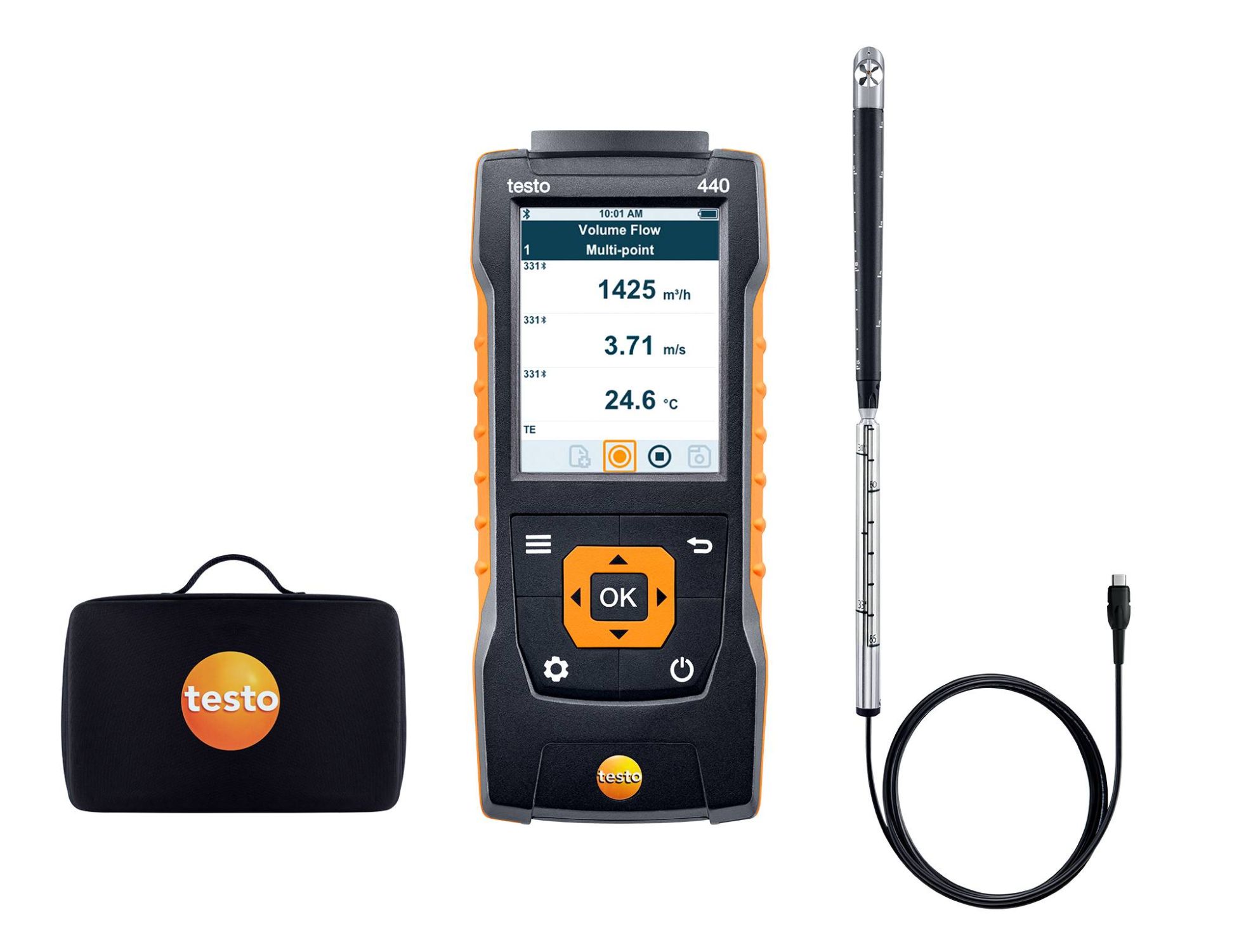 - Для вас теперь нет слишком сложных и нестандартных задач: testo 440 сочетает компактный портативный измерительный прибор с интуитивно-понятными меню и большим выбором зондов скорости и качества воздуха (зонды заказываются отдельно)