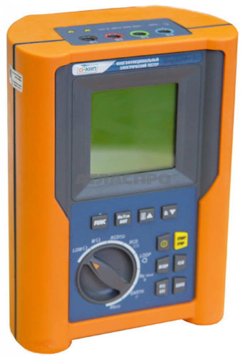 Многофункциональный электрический тестер для контроля и измерения параметров ЭБ (8 режимов: целостность, изоляция (до 1000 В / до 2 ГОм) , УЗО (АС и А типа, время отключения (1-999 мс), напряжение прикосновения 0-100 В, токи отключения (0,5-2,4 х Iн), ~U (до 265 В в 1Ф/ до 460 В в 3Ф), частота (15,3-99,9 Гц), петля (Ф-Ф, Ф-Н) и ток КЗ, полное сопротивление шины «земля» (1-1999 Ом,15мА), память 350 измерений, ЖК-дисплей (65 мм х 65 мм); оптический RS-232 для подключения к ПЭВМ или принтеру, питание 6 х 1,5 АА; масса 1,0 кг, Опции: кабель подключения, ПО