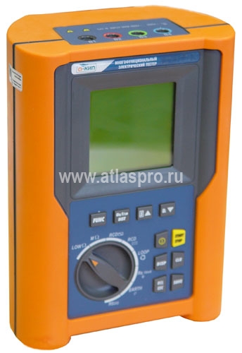 Многофункциональный электрический тестер для контроля и измерения параметров ЭБ (8 режимов, память 350 измерений: целостность, изоляция (до 1000 В / до 2 ГОм) , УЗО (АС и А типа; исполнение 10, 30, 100, 300, 500 мА; напряжение прикосновения до 100 В; время отключения (1-999 мс); токи отключения (0,5-2,4 х Iн); частота (47-63 Гц), петля (Ф-Ф, Ф-Н) и ток КЗ, полное сопротивление шины «земля» (1-1999 Ом,15мА), сопротивление заземления вольтамперметрическим способом (4 штыря, 0,01-1999 Ом), проводимость грунта (0,06 Ом х м -125.5 кОм х м); ЖК-дисплей (65 мм х 65 мм); RS-232 с кабелем подключения, ПО (CD-ROM), питание 6 х 1,5 АА; масса 1,2 кг