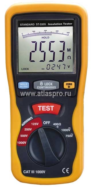 5505 проводит испытание изоляции до 4000 МОм с разрешением 1 кОм напряжением 125В, 250В, 500В и 1000В током 1мA.