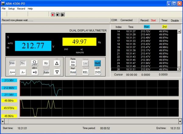Помимо кнопок управления, аналогичных кнопкам на передней панели прибора, в рабочем окне программы отображается статистическая информации по измерениям, а так же графическое отображение двух измеряемых параметров. Слева от графика отображаются минимальные, максимальные и средние значения обоих параметров.