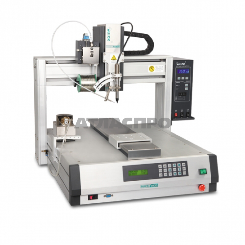 Этот настольный паяльный робот QUICK 9433 специально разработан для автоматизации процесса пайки и представляет полностью автоматическую систему управления процессом пайки, позволяющую перемещение с высоким разрешением по 3 осям: X/Y/Z (три декартовы координаты). Кроме того, QUICK 9433 обеспечивает более простые инструкции программирования, лучшие параметры, больший объем памяти и более высокую скорость. Все это дает высокий рост производительности.