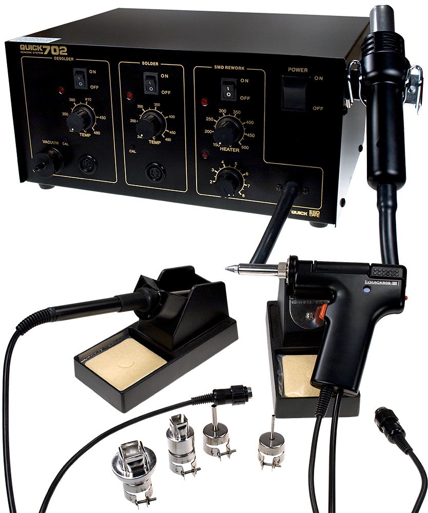 Трехканальный ремонтный центр, независимая работа всех секций, потребляемая мощность 500Вт, паяльная станция:-керамический нагревательный элемент,-напряжение питания паяльника 24В,- диапазон рабочих температур 200°С - 480°С,- стабильность поддержания температуры ±1°С,термофен:- термостат обеспечивает постоянство температуры воздушного потока,- диапазон рабочих температур 150°С - 500°С